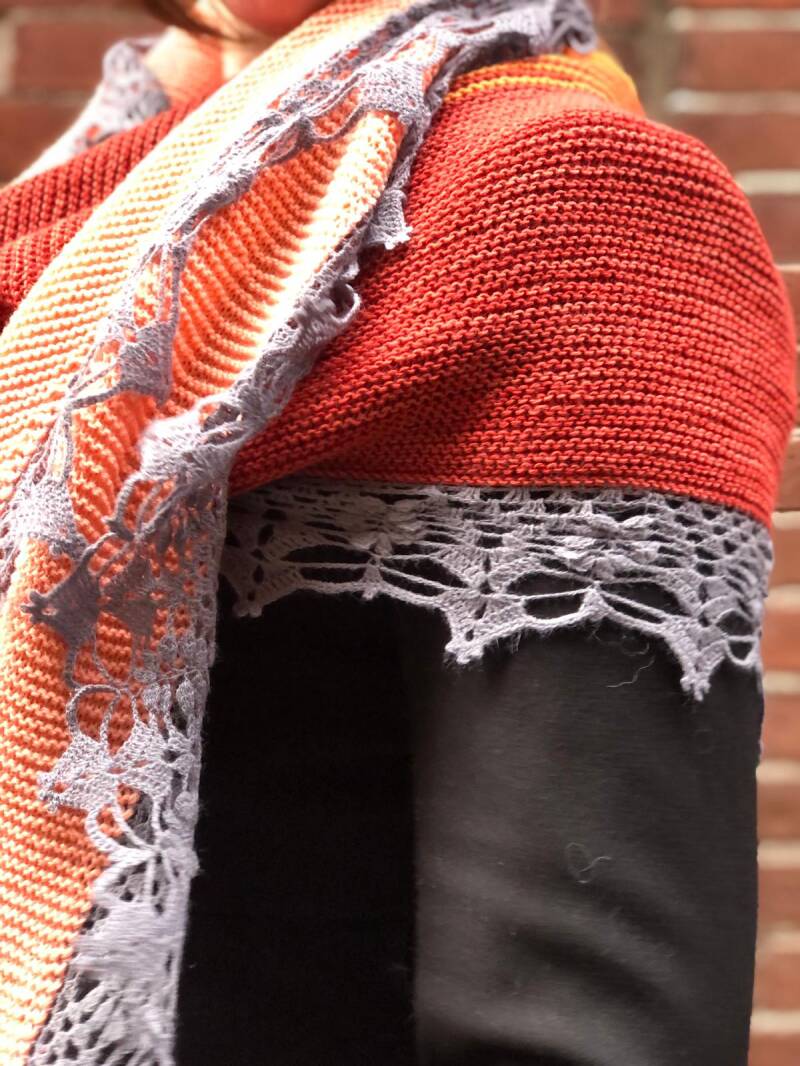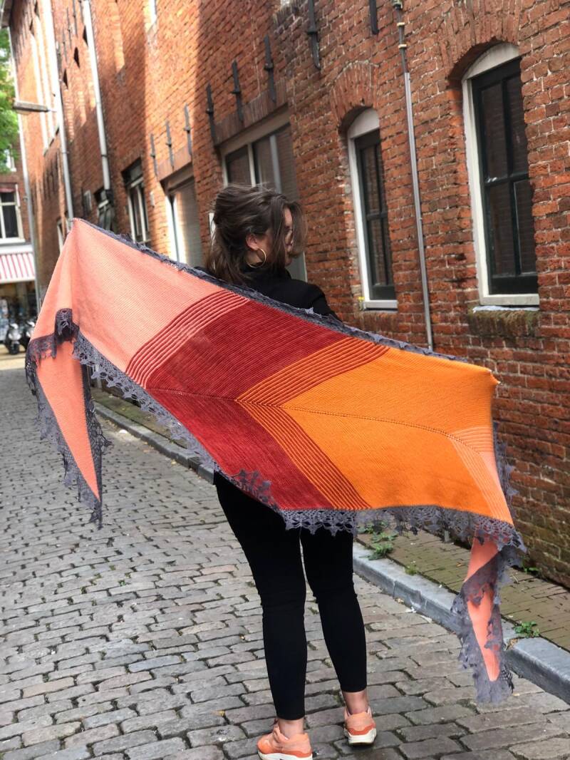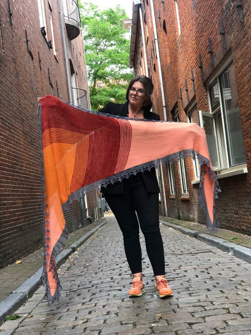 The Sunset ribbings is a wonderfully large shawl! Ideal for the colder summer days or as a colorful accessory in the winter. The Sunset ribbings is an easy scarf to knit. It just takes some patience! The details in the scarf due to the crocheted lace edge and the clear center line, make it an interesting whole!