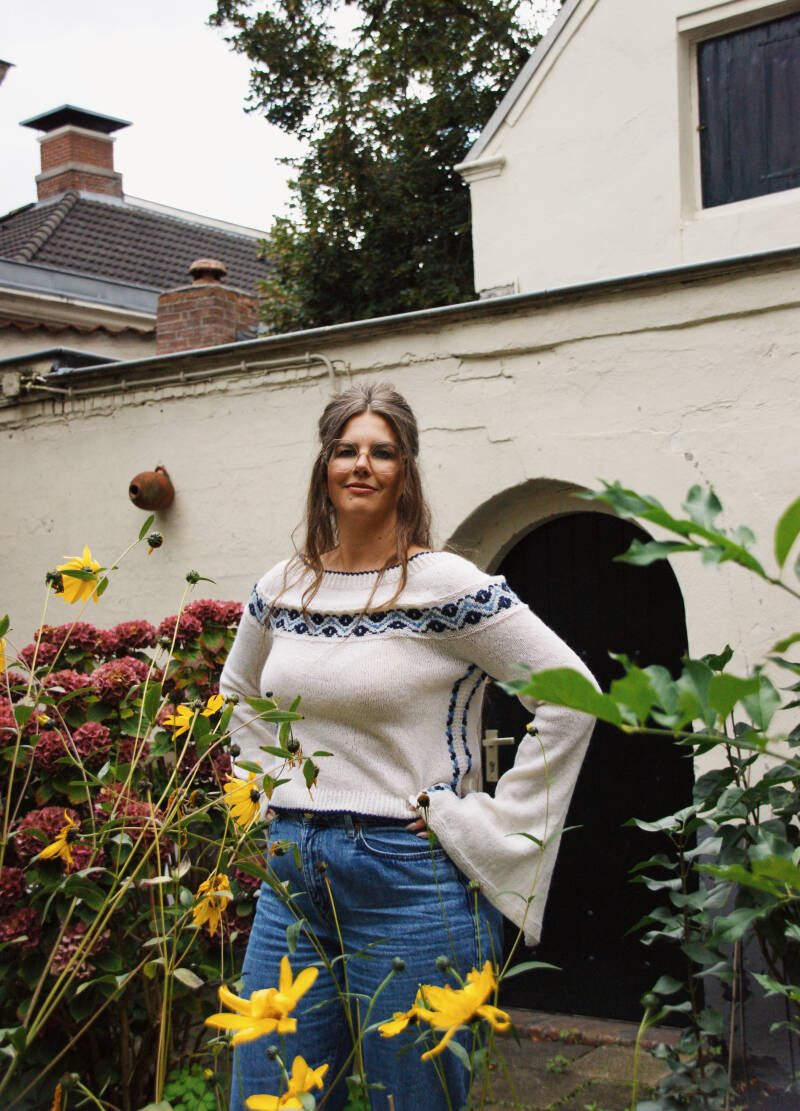 This sweater is knitted top down in the round and has long striking sleeves with a split. The small knitting color work is what is called Roositude knitting, which is similar to normal knitting color work. The back and front pieces also differ in length, which creates a playful effect!
