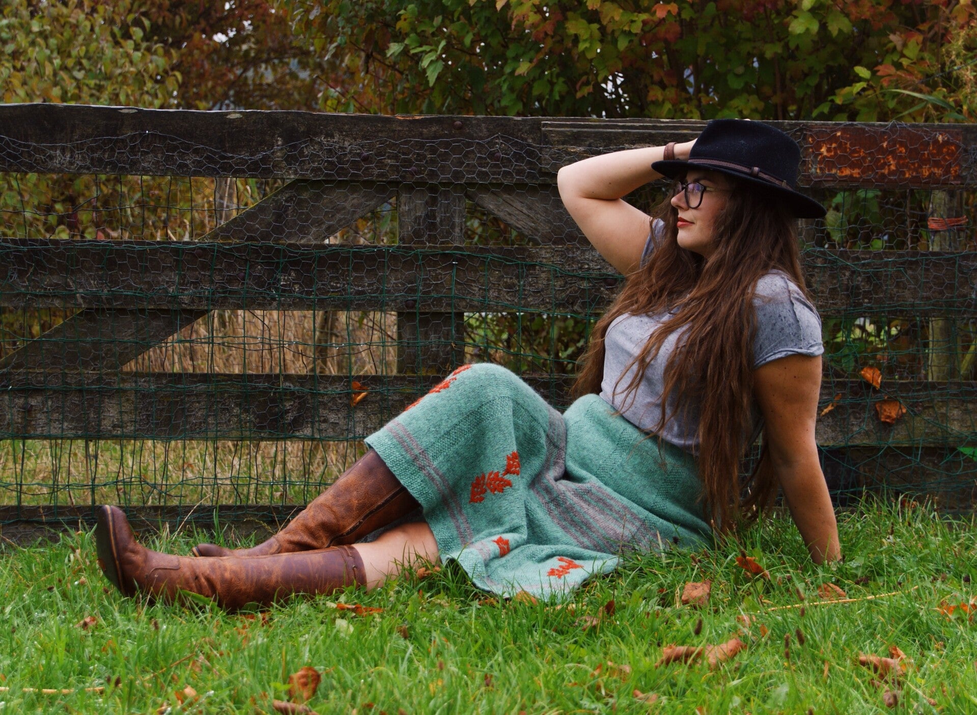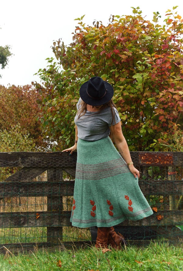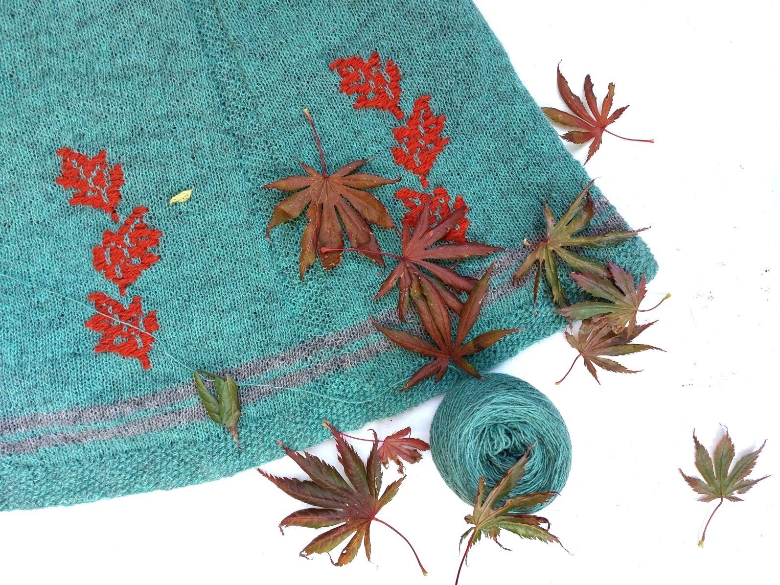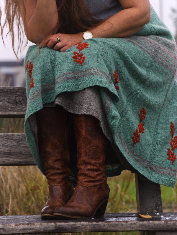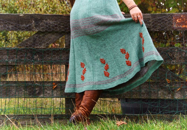 Falling leaves skirt is worked from the bottom up. The edge is knitted with a double strand to create more weight at the bottom. The shape of the skirt is called a 'bell skirt'. The model is created by making decreases every few centimeters.