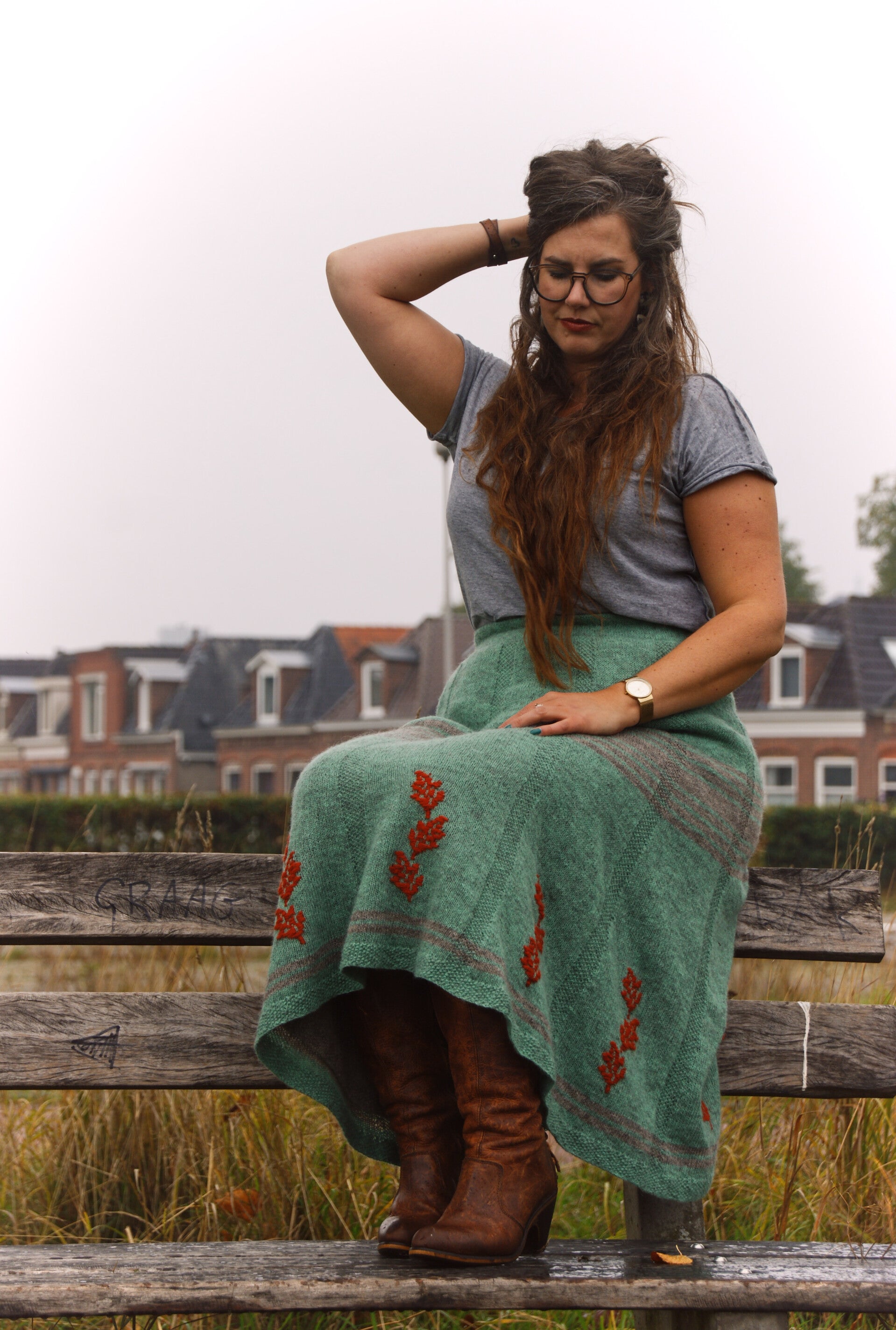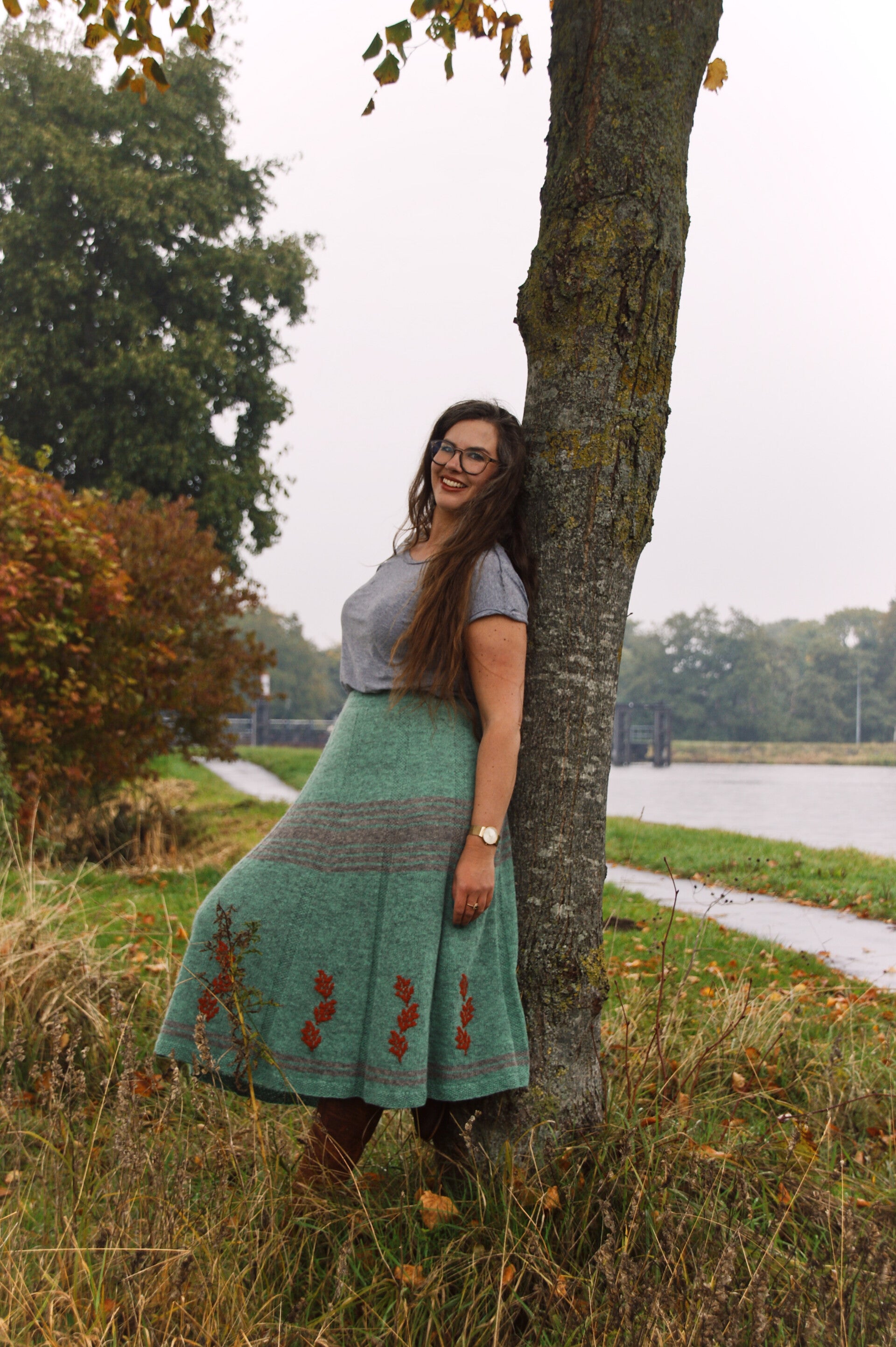 The Falling leaves skirt also contains an inner skirt. This creates a smooth and swingy look. The extra warmth that is created in this way is also very pleasant in autumn and winter. The Roosimine leafs are repeated on every panel of the skirt.