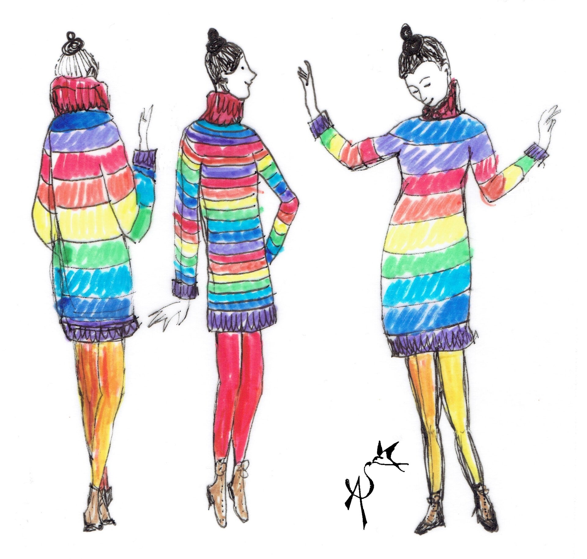 Deze jurk omhult je als een cocon. Het werk wordt van beneden naar boven gebreid. De regenboorg trui jurk bestaat uit 7 kleurblokken die even groot zijn. Fun fact: langs de zijnaden worde een 2 bij 2 rib patroon gebreid van beneden naar boven.