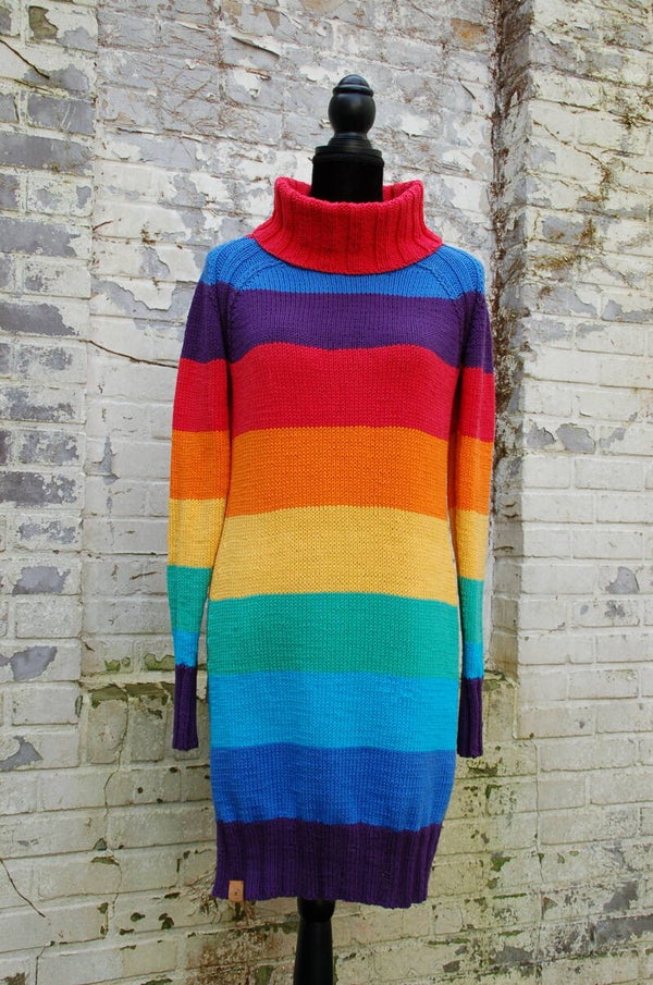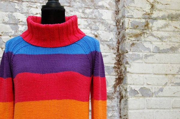 This dress hugs you like a cocoon. The piece is worked from the bottom up, and has raglan shaped shoulders. The dress's rainbow consists of seven colors. Each color block is the same width. Fun fact: The seam is worked in 2 by 2 rib and is worked from the bottum up pattern wise.