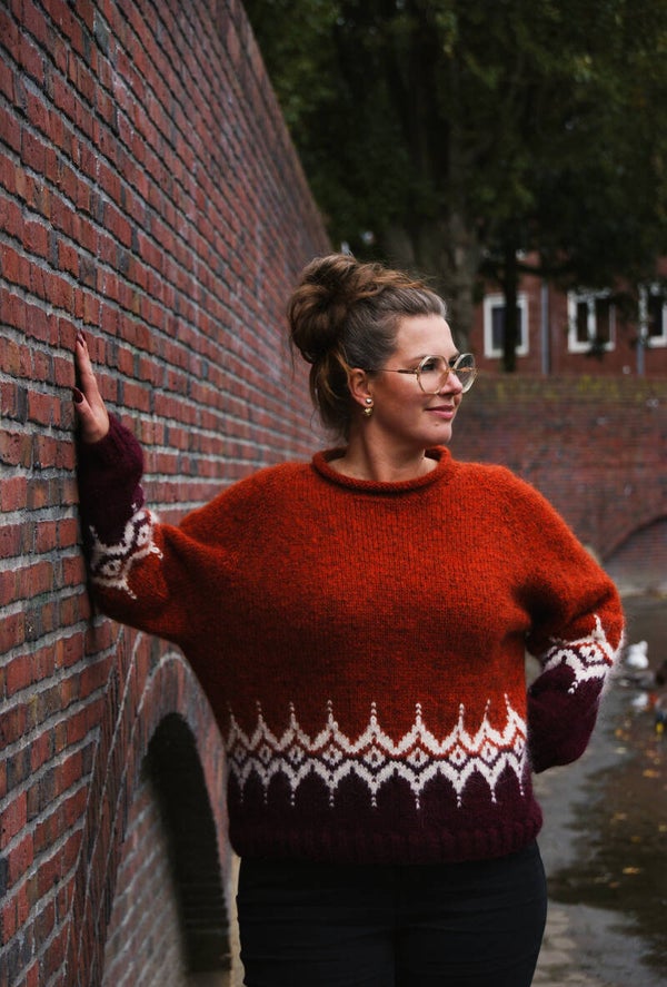 Zomer 2024: Een bijzondere vakantie naar Ijsland, is mijn inspiratie geweest voor deze oversized trui! Tijdens een rondrit door het prachtige landschap waar zoveel mooie natuur te zien en beleven valt, wilde ik dit vast leggen in breiwerk. De trui word topdown gebreid en heeft raglan mouwen. Het duidelijke witte patroon steekt mooi en helder af tegen de twee kleurige achtergrond. De trui heeft een oversized fit. Maat zoals getoond op de foto: 44