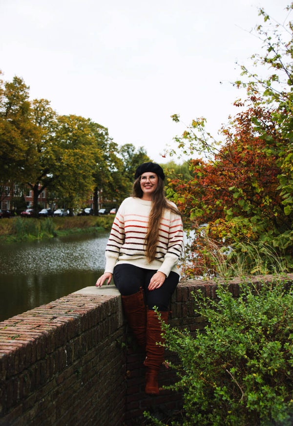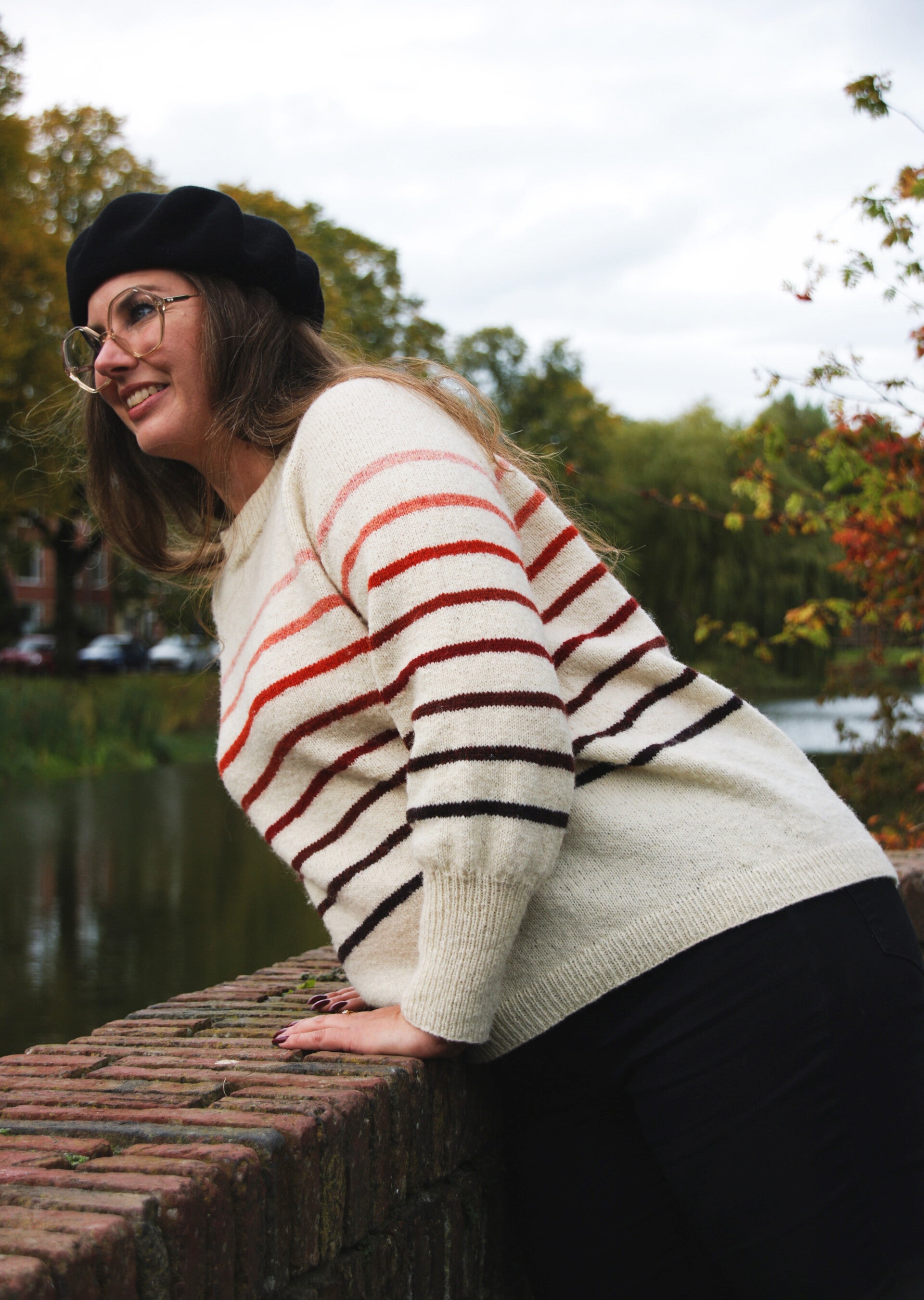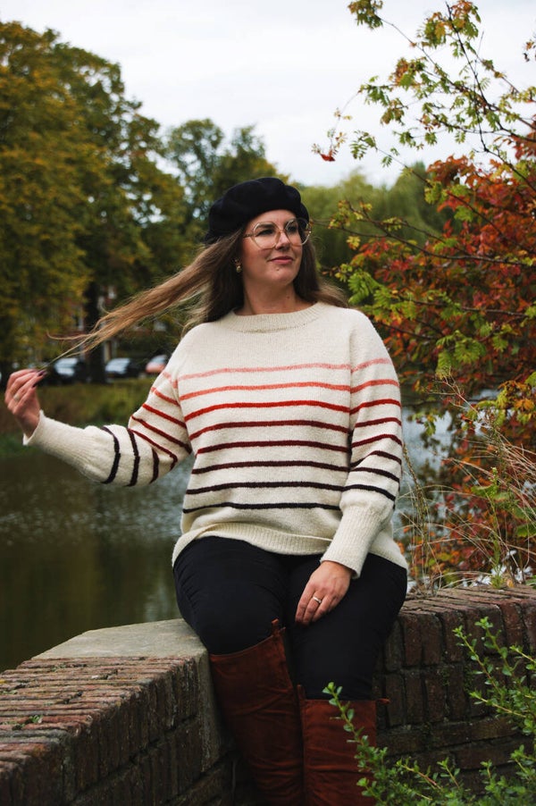 A lovely oversized raglan sweater, that is the striped sweater. It is knitted top down. The stripes pattern starts with a light color and becomes darker as the stripes progress. The sweater has an extra fitting space of 16 cm, so it feels nice and spacious! The arms have a long cuff, which you can fold to your liking. Size as shown in the photo: 44