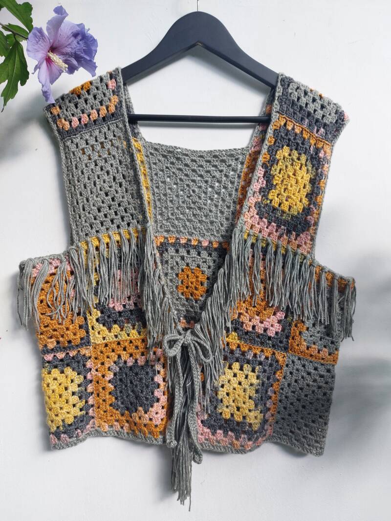 Een kort gehaakt vestje in Granny style! Dat is de ‘Fringe it up’! De franjes aan het vest geven het geheel een net wat speelsere look.