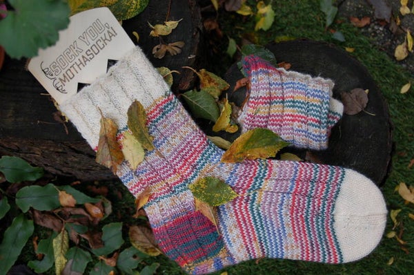 Little skeins of sock yarn, leftover sock yarn or whatever you have. (1 basic neutral color and 1 self-striping yarn for a playful stripe effect)