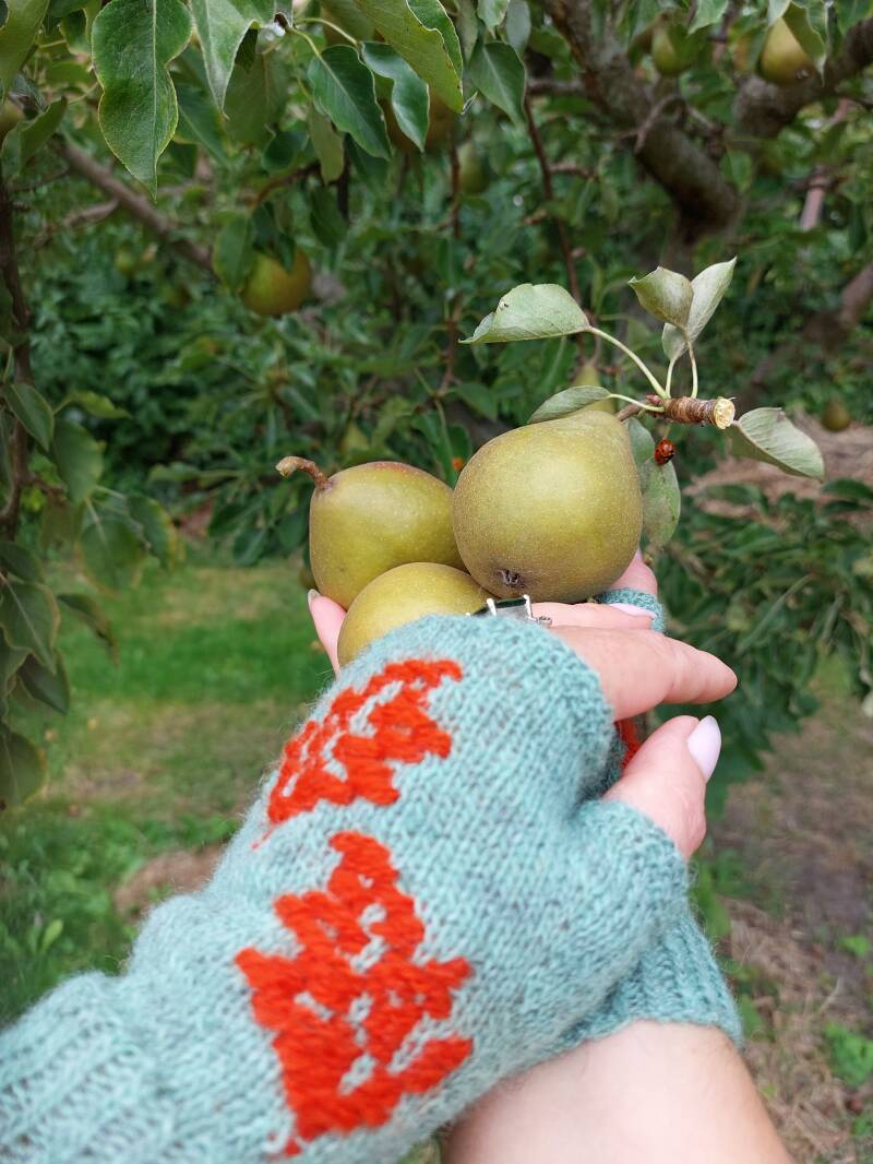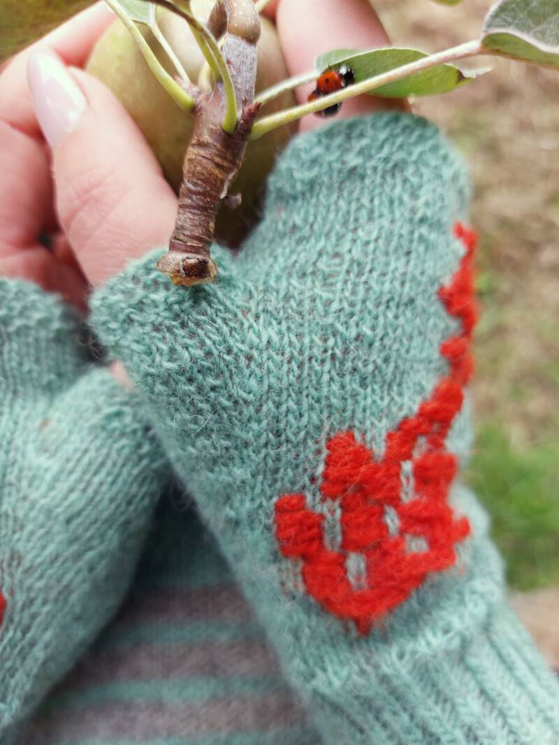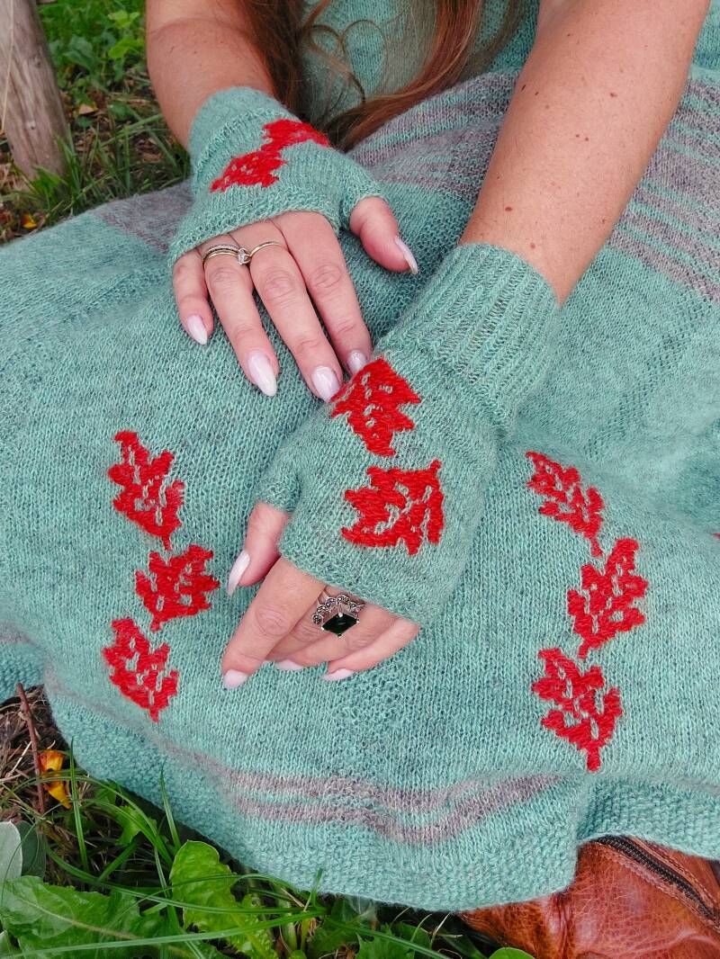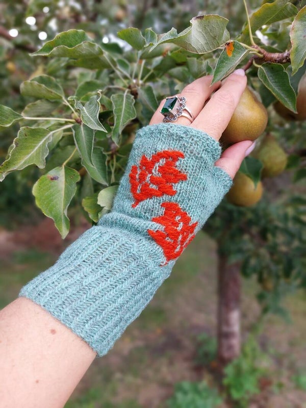 Brei bijpassende handschoenen bij de Falling leaves skirt! De handschoenen brei je net als een sok en worden van onder naar boven gebreid. Het blaadjes patroon word als het ware tijdens het breien ingeweven in het breiwerk. Als een soort borduren. Hoe dat in zijn werk gaat, komt aan bod in dit geschreven patroon.