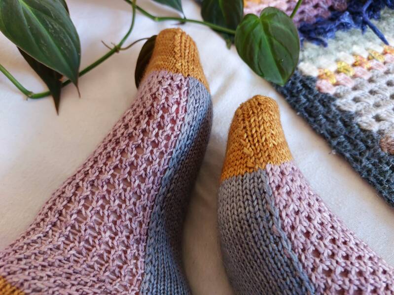 De sok bestaat uit 6 onderdelen. Als eerste word de boord opgezet met picot rand. Aansluitend de enkel/ been. Vanaf hier word het werk in tweeën gesplitst, en breidt je eerst de bovenkant voet (BV) van de sok in het kant patroon. Daarna is de hak aan de beurt. Vervolgens word de onderkant voet (OV) gebreid welke al breiend aan de BV van de sok word bevestigd. ‘Join as you go’ zeg maar… Als laatste word de teen in het rond gebreid.
